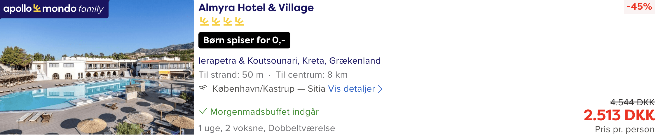 Vi har fundet tilbuddet på Apollo. Her har vi taget udgangspunkt i den billigste afgang den 31. maj.