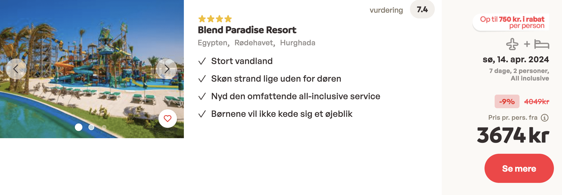 Vi har fundet tilbuddet på Sunweb. Her har vi taget udgangspunkt i den billigste afgang den 14. april.