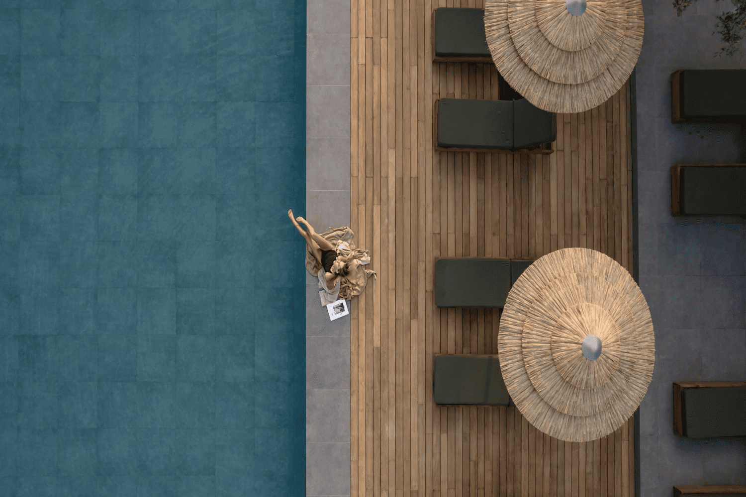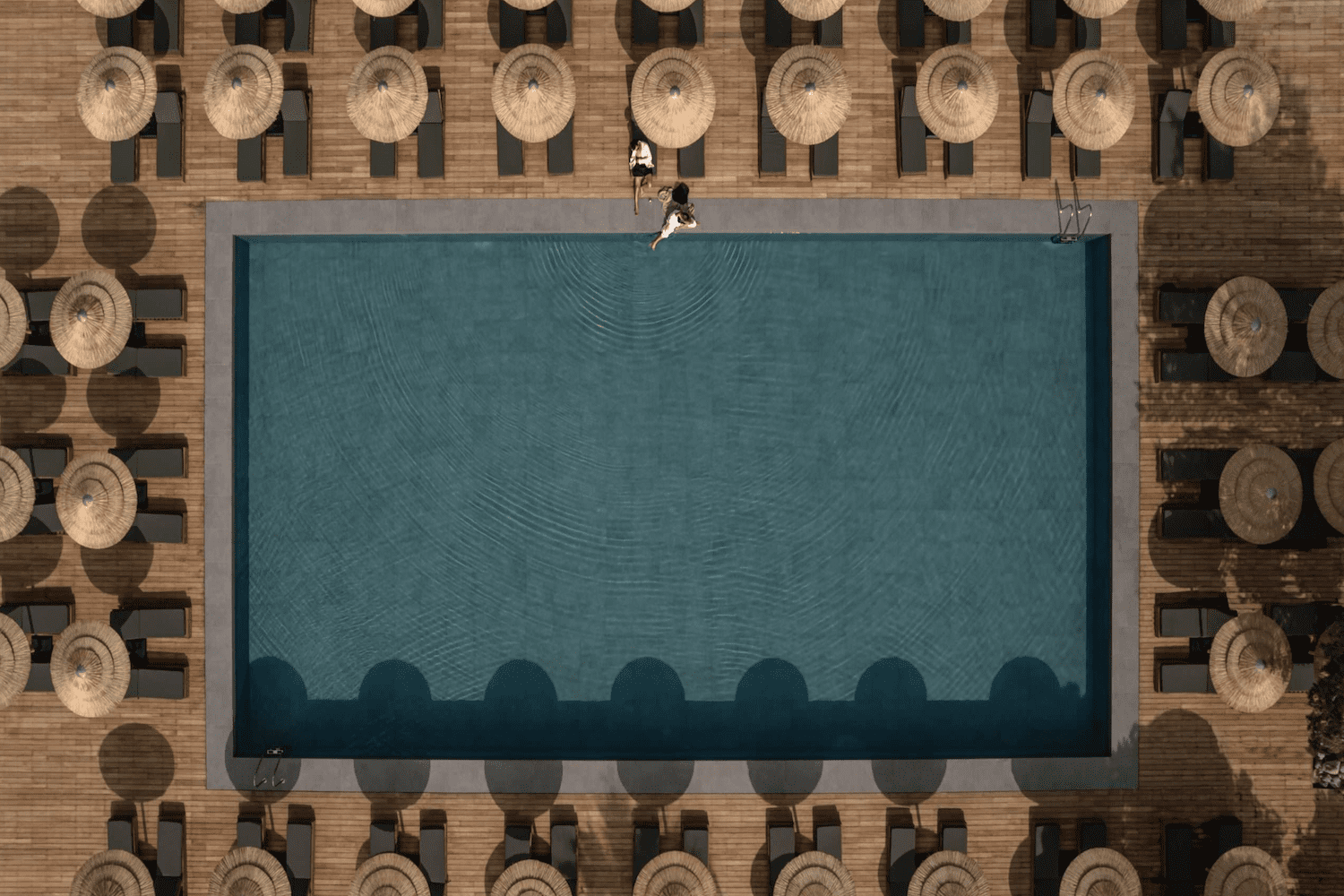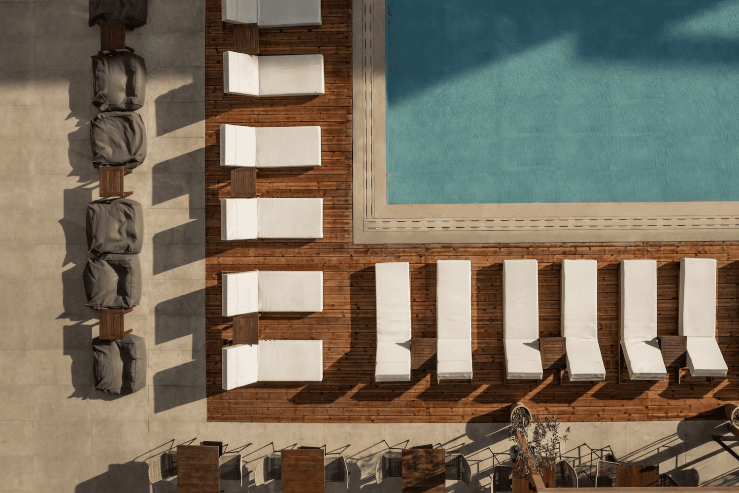 Her finder du et lækkert poolområde med loungestemning, gode drinks og masser af plads til at slappe af.