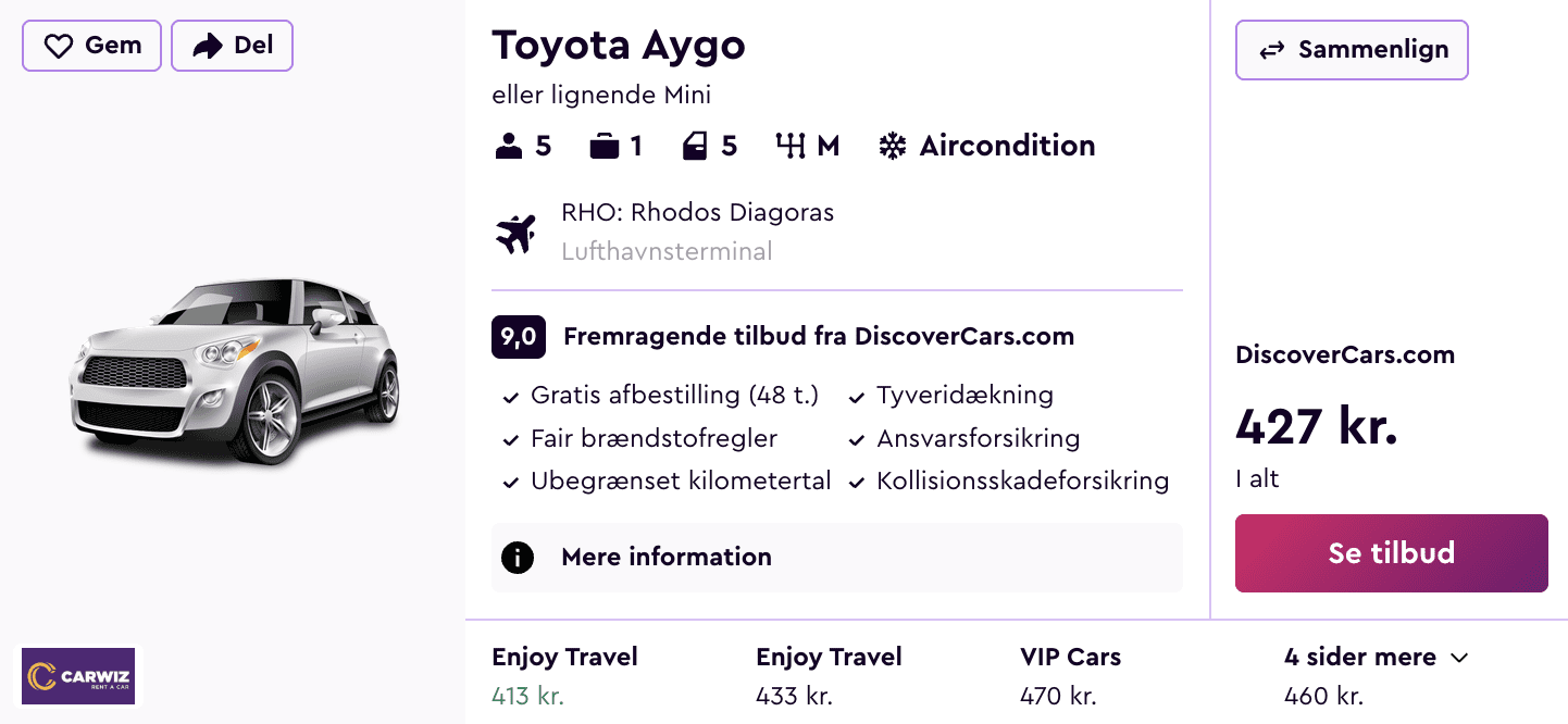 Fra den 25. april – 2. maj kan du finde lejebiler for helt ned til 427 kr. – og det er vel at mærke for hele perioden inkl. ubegrænset kilometertal.