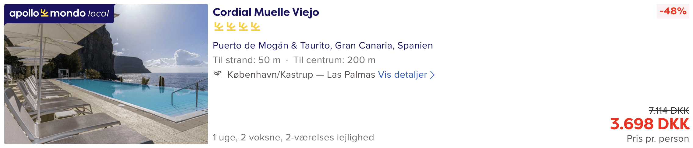 Er du klar til at dykke ned i en uges solbeskinnet luksus? Denne gang har vi fundet et fantastisk tilbud på en uges ferie til Gran Canaria, hvor du skal bo på det 4* lejlighedshotel Cordial Muelle Viejo. Her kan du vågne op til lyden af bølger, nyde din morgenkaffe med udsigt over havet og bare lade roen sænke sig. Og det bedste af det hele? Prisen er så lav, at du næsten ikke vil tro dine egne øjne!