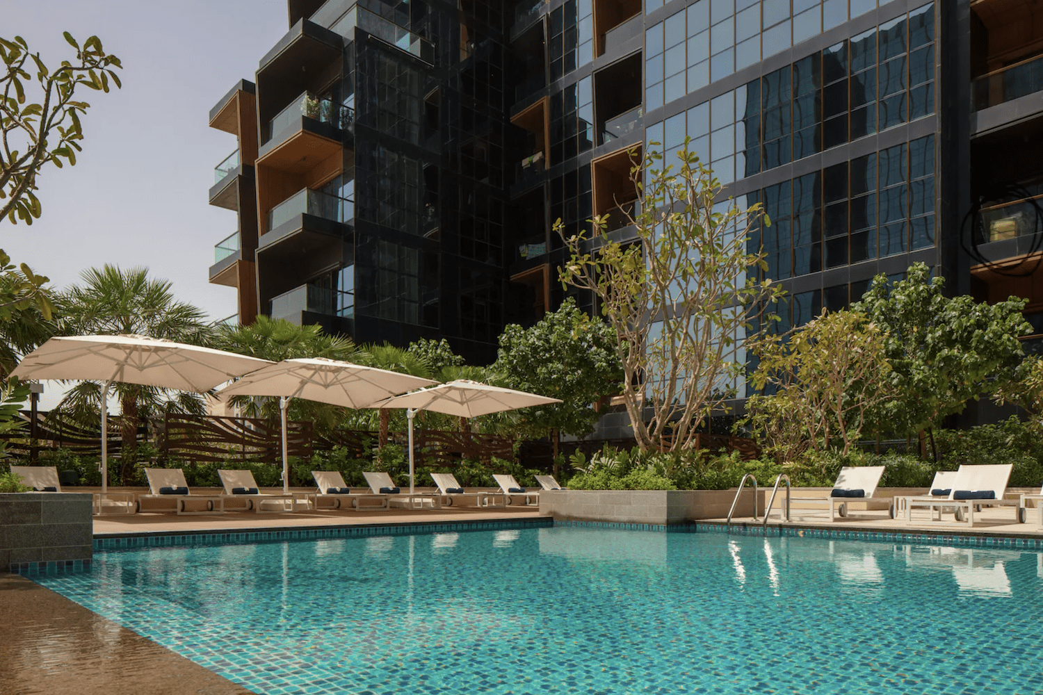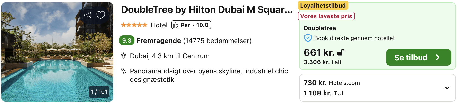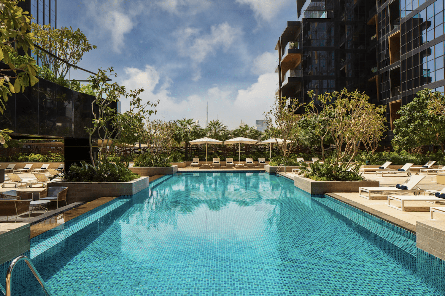 DoubleTree by Hilton Dubai M Square er et moderne 5* hotel med et lækkert poolområde, hvor der er god plads til både solstole og pauser i skyggen 😎