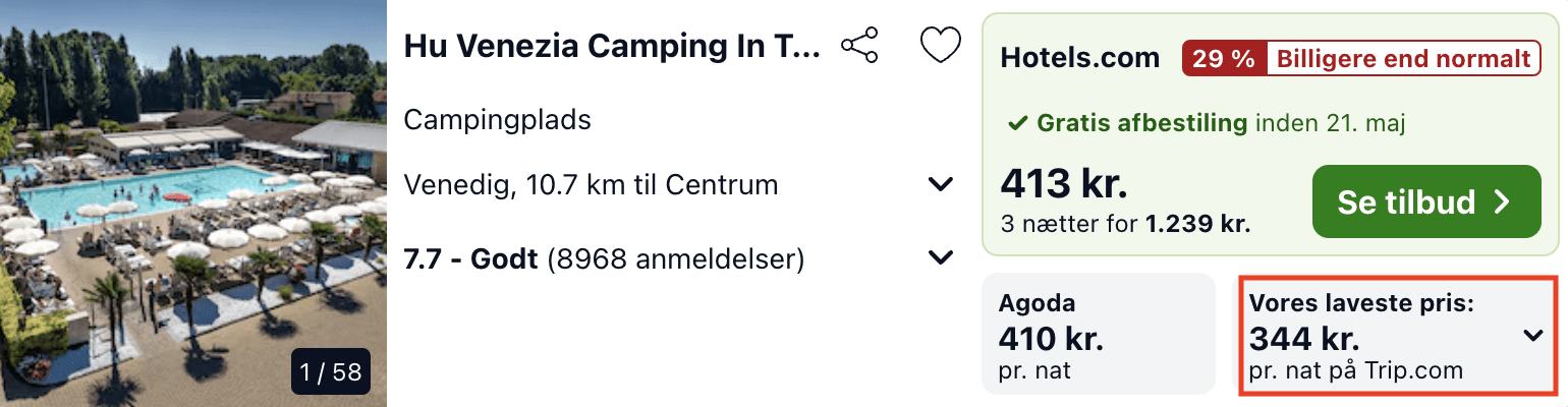I dette eksempel har vi taget udgangspunkt i et tre nætters ophold på Hu Venezia Camping in Town fra onsdag den 22. maj til lørdag den 25. maj.