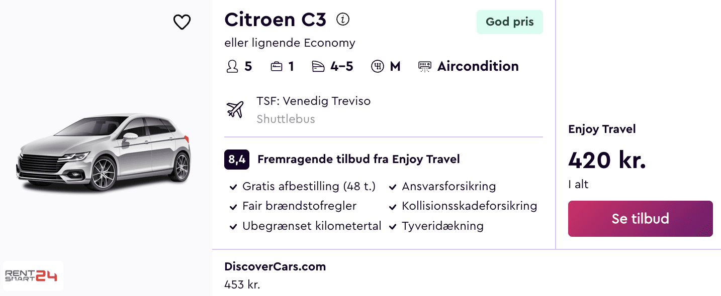 Alternativt kan du også vælge at leje en bil. Du kan f.eks. leje en Citroen C3 med ubegrænset kilometertal i hele rejseperioden for 420 kroner.