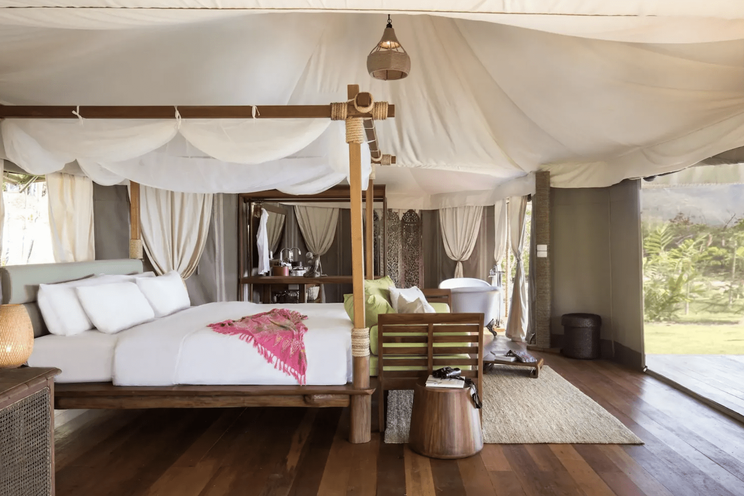 Det rummelige telt er indrettet med kingsize-seng, aircondition og lokale materialer, så du både får følelsen af at være i ét med naturen og samtidig kan nyde godt af moderne bekvemmeligheder.