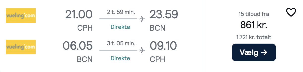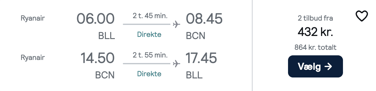 I dette rejseeksempel skal du flyve fra Billund Lufthavn, hvor du i øjeblikket kan finde flybilletter tur/retur til Barcelona fra tirsdag den 27. august til lørdag den 31. august for 432 kroner.