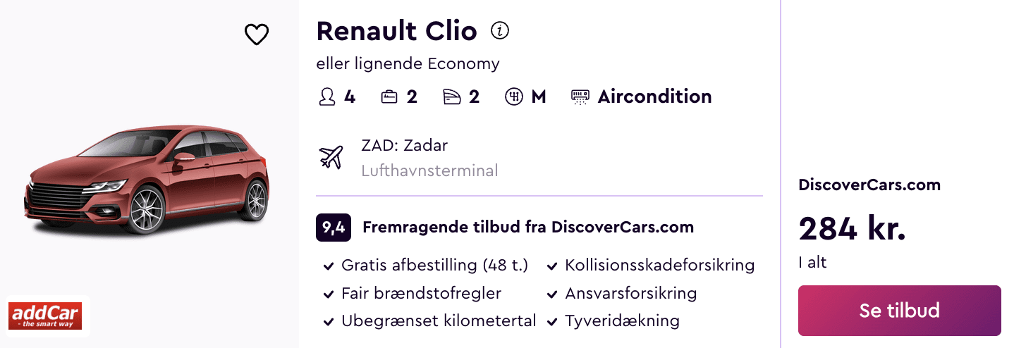 Alternativt kan du også vælge at leje en bil. Du kan f.eks. leje en Renault Clio med ubegrænset kilometertal i hele rejseperioden for 284 kroner.