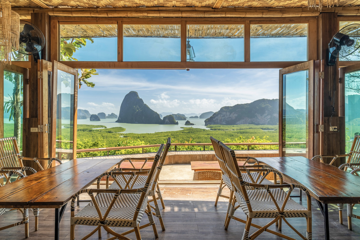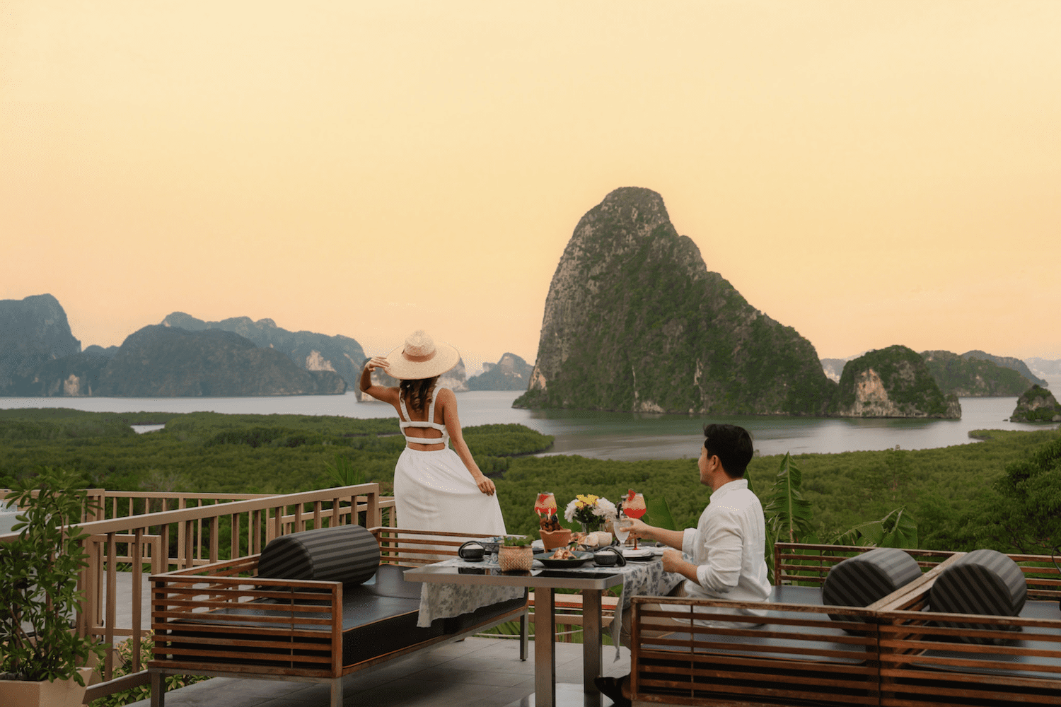 Forestil dig at vågne op til en af Thailands mest ikoniske udsigter – bugten ved Phang Nga med hundredvis af kalkstensklipper, der skyder dramatisk op af det smaragdgrønne vand.