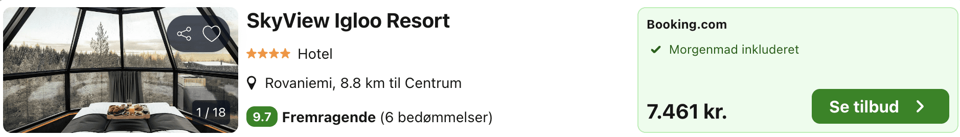 Og ja… det er faktisk ret billigt. I december kan en enkelt overnatning på SkyView Igloo Resort nemlig snige sig op omkring 30.000 kr. 😅