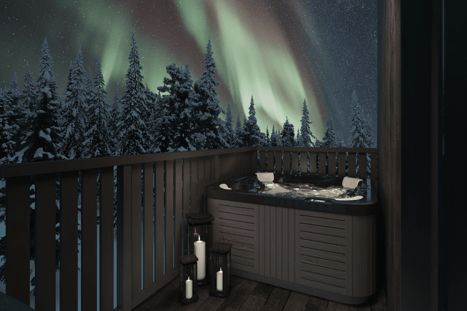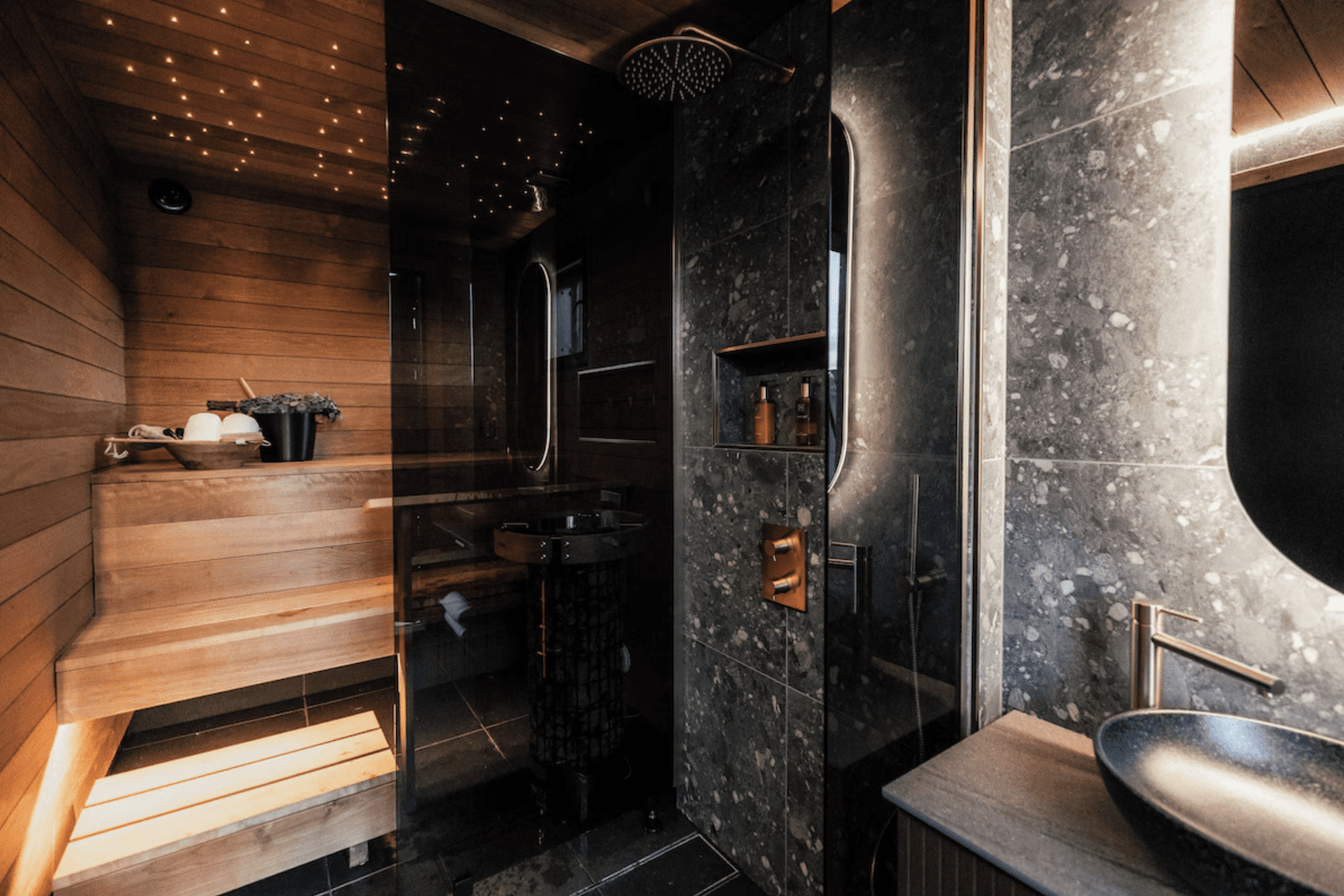Igloerne har både privat jacuzzi og sauna, så du kan nyde varmen, mens du kigger ud på den sneklædte natur.