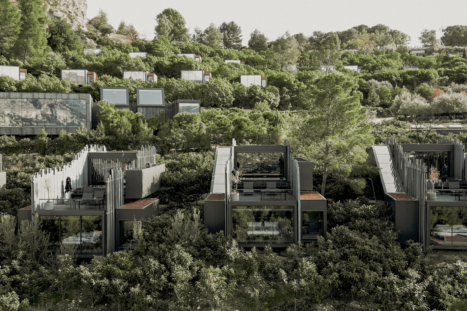 Her bor du i arkitekttegnede suiter, hvor gulv-til-loft-vinduer trækker naturen helt ind i værelset, så du kan vågne til udsigten over bjerge og olivenlunde.