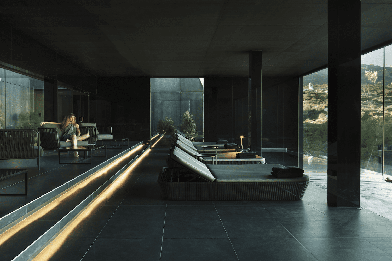 Spaen er bygget i flere niveauer og integreret i landskabet, så hver eneste pool, sauna og relax-zone har panoramavinduer.